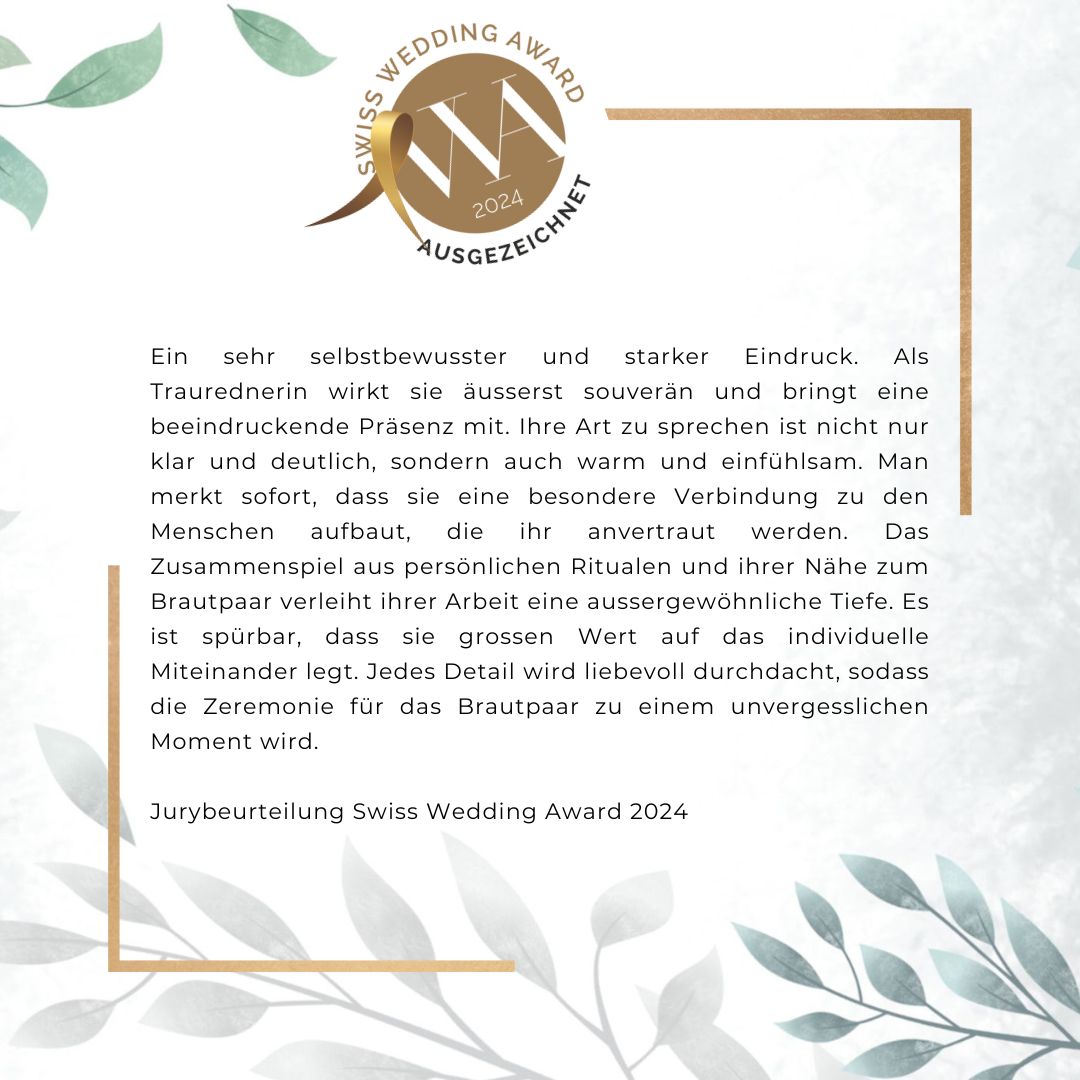 Als leidenschaftliche Romantikerin bin ich fasziniert von Liebesgeschichten. Es gibt für mich keinen schöneren Anlass zu feiern als die Liebe selbst und die Geschichten, die sie schreibt. In meiner Arbeit als freie Traurednerin gestalte ich einzigartige und liebevolle Hochzeitszeremonien, die unabhängig von Kulturen und Glaubensrichtungen sind. Doch nicht nur Hochzeiten, auch Taufzeremonien, Scheidungsrituale, Beerdigungen, Abschiedsfeiern für Tiere und weitere prägende Momente im Leben begleite ich individuell und herzlich.
